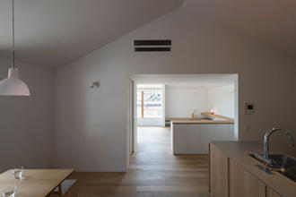草加の家 新興住宅地に建つ住宅です。 周囲を様々なサイズの建物に囲まれた環境において、 景色に頼りすぎず、空間の大きさにメリハリをもたせ、 包まれるような居心地をつくった住宅です。