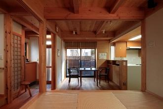 4.5畳の畳リビング+4.5畳のダイニングの小さな家ですが、障子の開閉で広くも狭くも使えます。内装材はすべて自然素材を使い、構造の梁を表しにしています。道路との境界にカナダ杉の塀を立てて中庭のように計画しています。