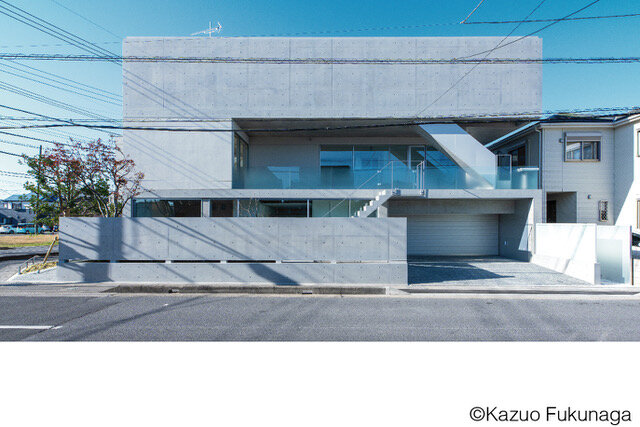 [Mi]東京都心から車で1時間圏内にある個人住宅。外部と内部が親密な関係をもつよう、シフトした各層のヴォリュームの間にトップライトやテラスが挿入され、螺旋状の動線が内外を巡る。精度の高いコンクリートや、異なる素材の使用やディテールによって、ミニマルで質の高い空間を実現している。RC造/326.27㎡