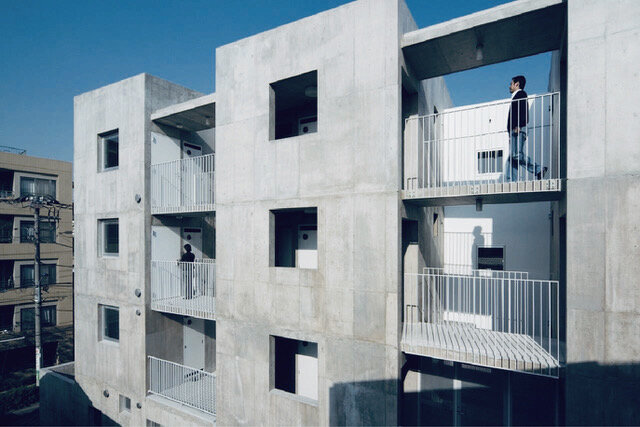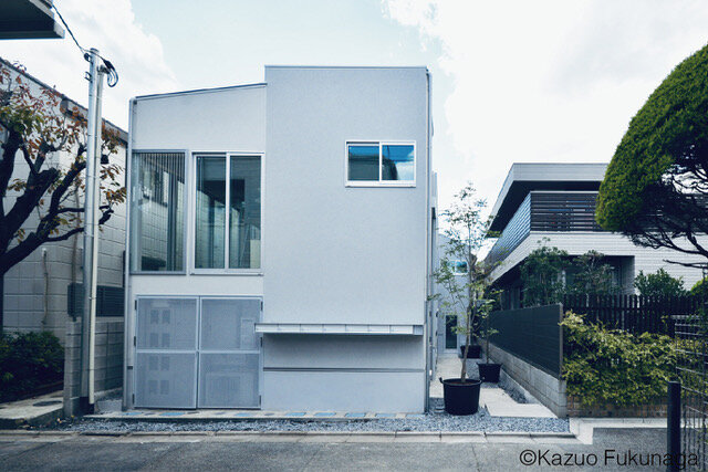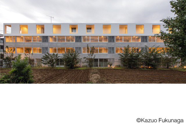 [MNH]高さ制限10mの高度地区内に、4層のヴォリュームを実現している。1階に障がい者グループホーム、2・3階に賃貸集合住宅、4階に二世帯住宅を重ねたコンプレックスな構成。限られた階高による圧迫感を感じさせないよう、連続水平窓により伸びやかな住戸が実現している。RC造/1452.58㎡(OZONEプロデュース)