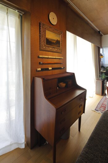 壁面には有孔ボードを設置し、趣味の楽器をすぐ手に取れる位置に。