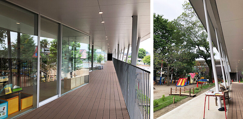 園庭を囲むテラスを設置する事で、運動会など2階席として利用する事ができます。