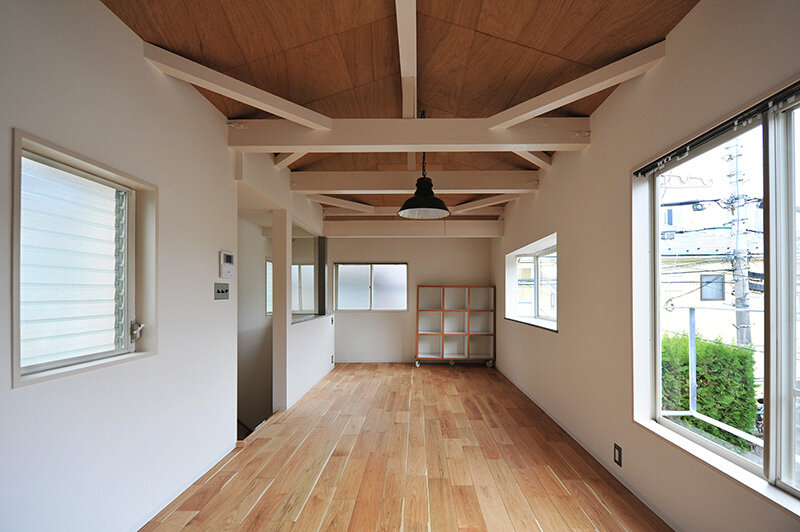 2階は、アラワシの梁が特徴的な空間だったため、梁はそのままの状態で残しました。更に梁の存在を際立たせる為、元々白い壁紙が施されていた勾配天井部分に木の化粧板を張っています。