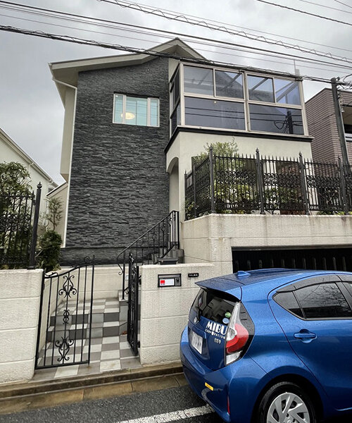 世田谷区の住宅街、緑道沿いの住宅。もともとの建物は外壁の半分くらいに石が貼られ、バルコニーには後付けのサンルームが設置されていました。